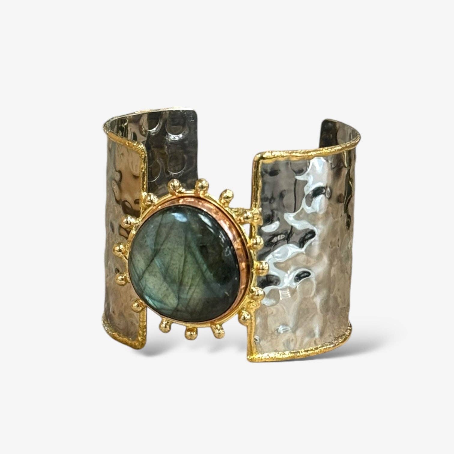 This elegant Dana Cuff features a broad hammered design with a stunning, round natural stone centerpiece.