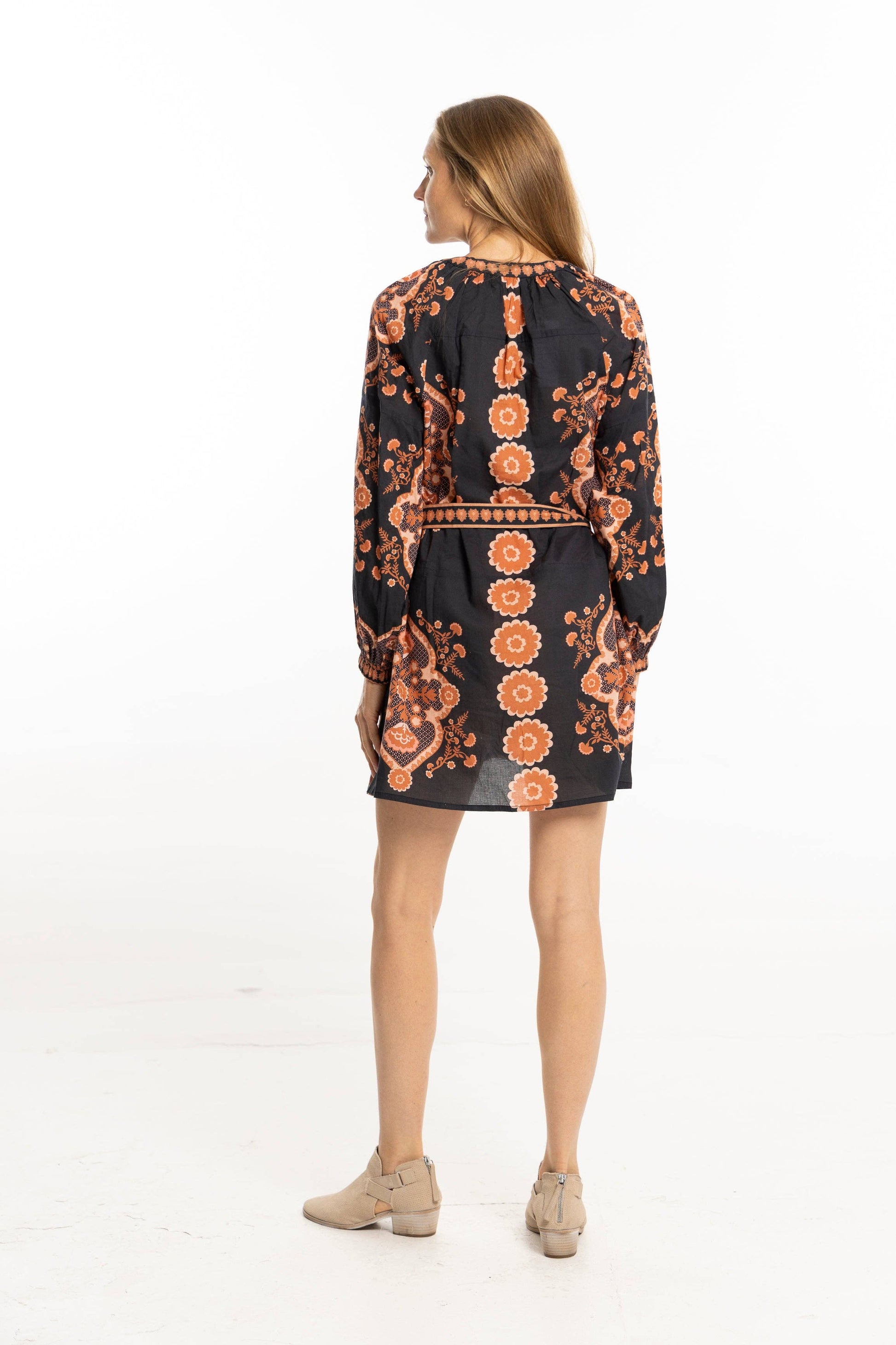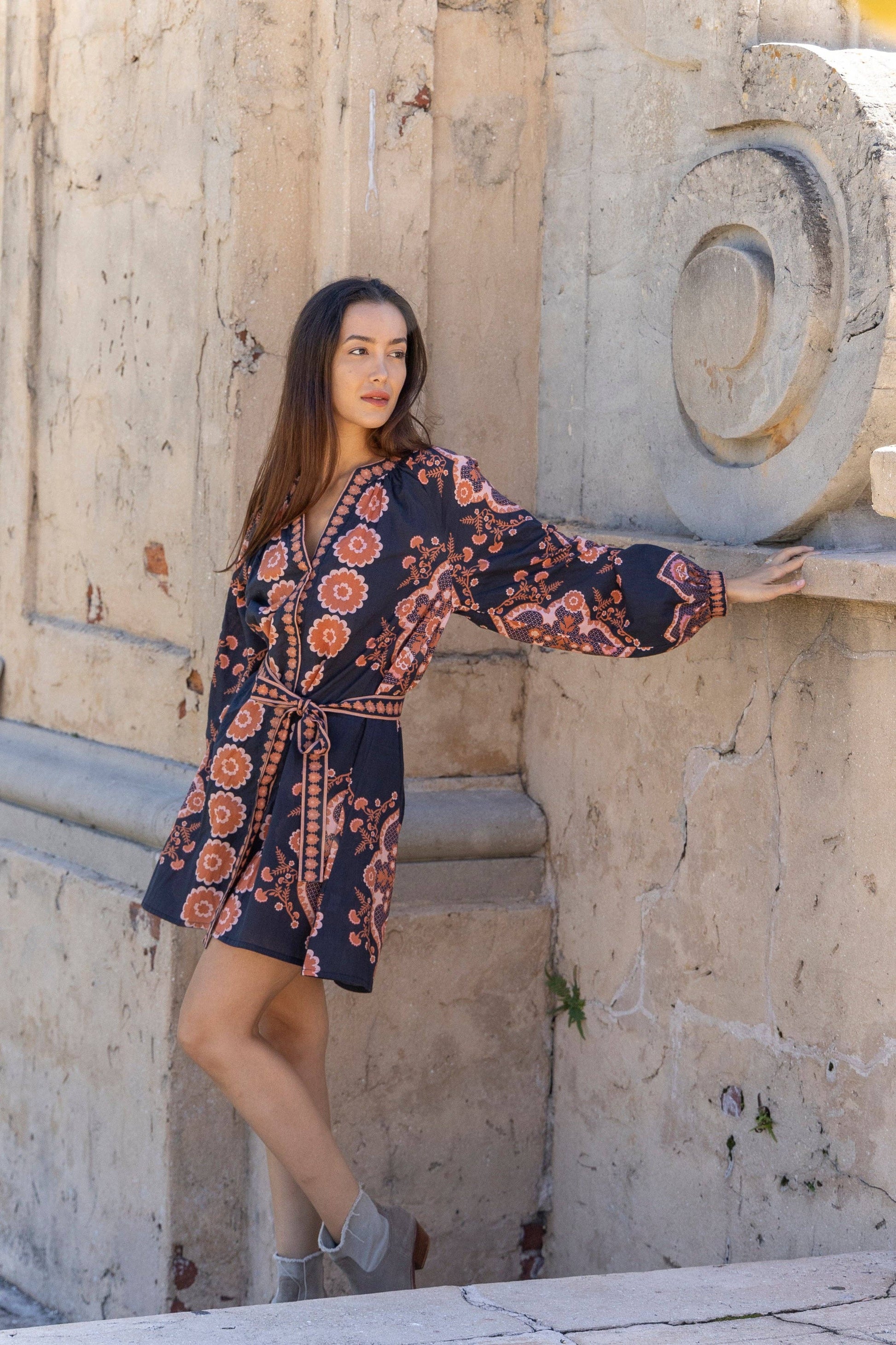 A breezy button-down shirt dress with gently ballooned sleeves, crafted from lightweight cotton and adorned in a beautiful block print in autumn colors. Designed in an easy, flattering silhouette to suit every shape, this timeless piece is effortlessly versatile.