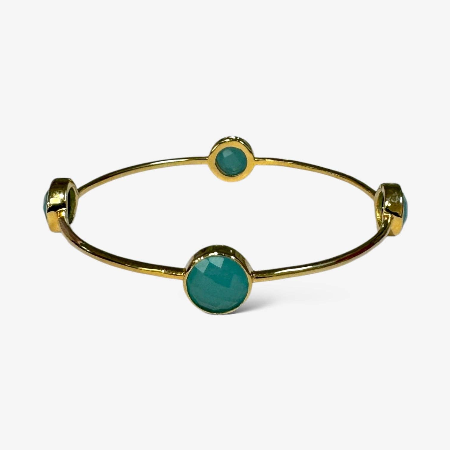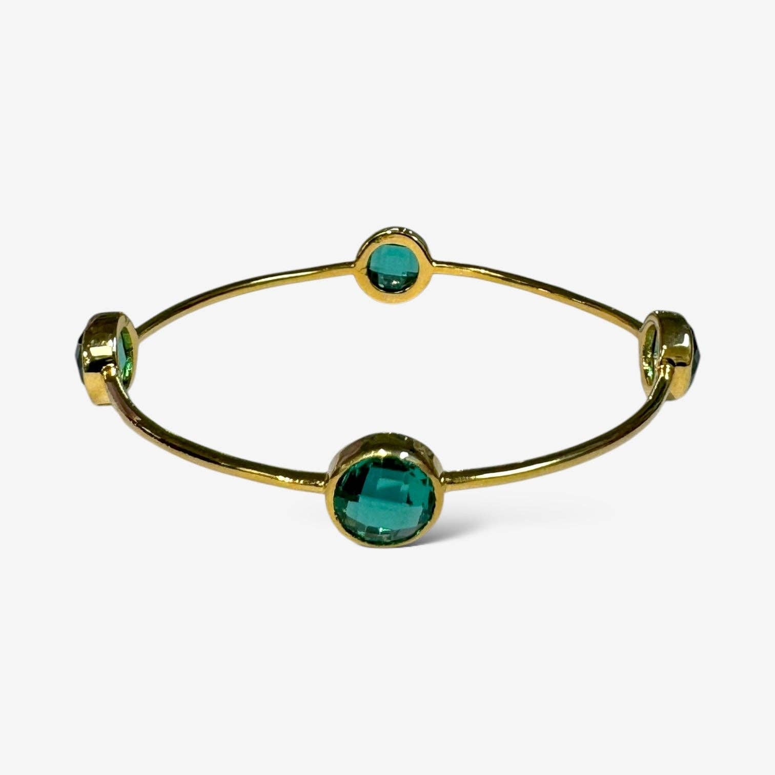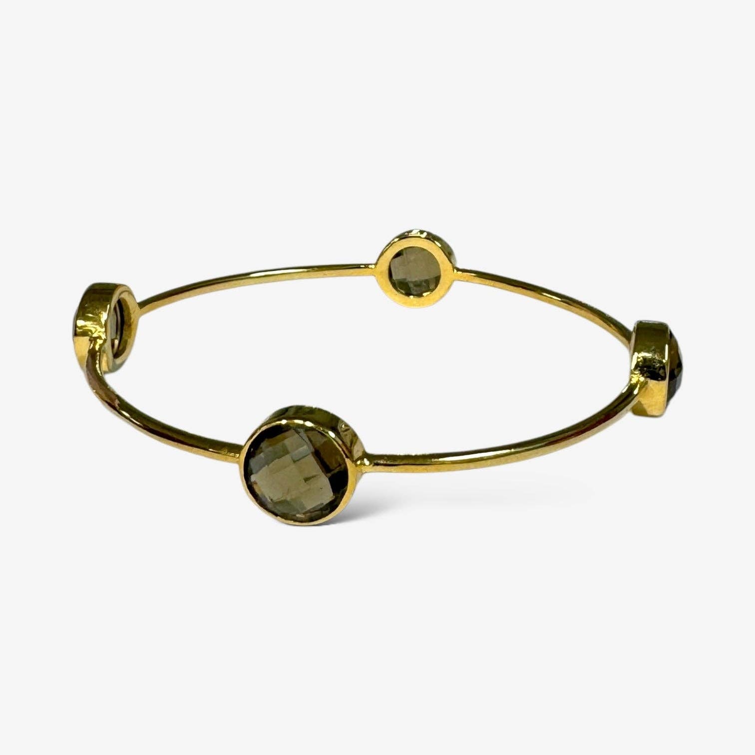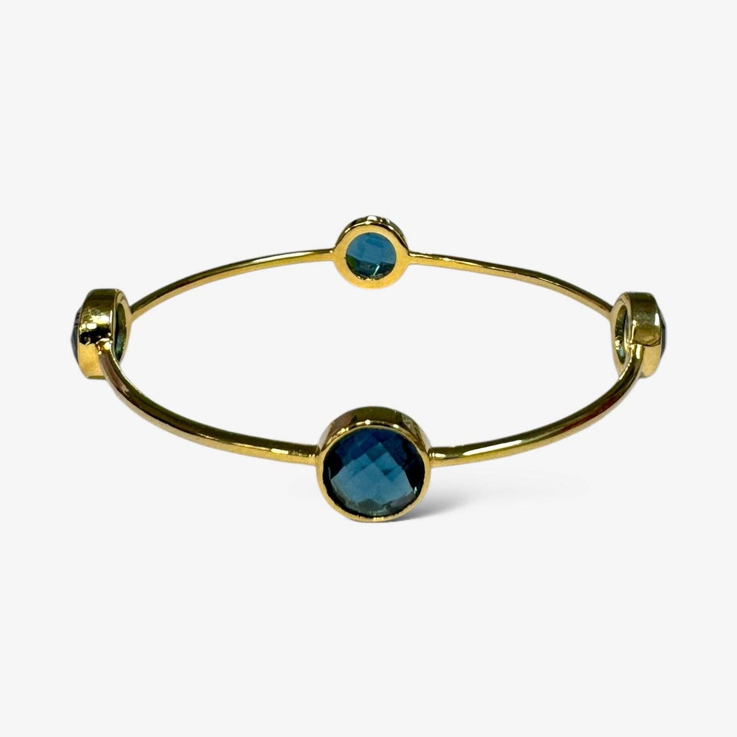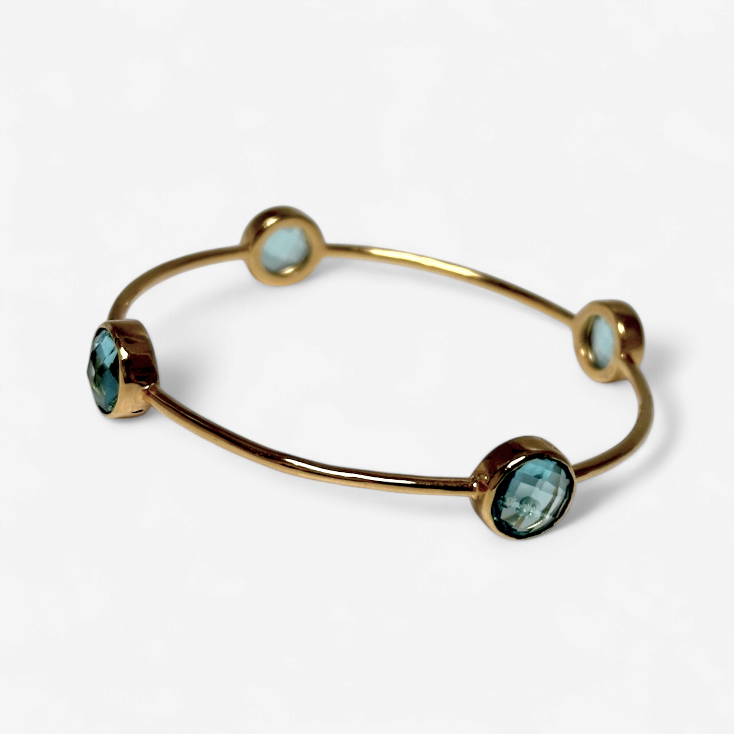 This elegant Hydro Twist brass bracelet features a 14kt gold plating, adding a luxurious finish to the design. It is adorned with four round hydroquartz stones, each carefully set to surround the bracelet with their radiant, translucent glow. The combination of warm gold tones and the subtle sparkle of the stones creates a sophisticated and timeless accessory, perfect for any occasion.