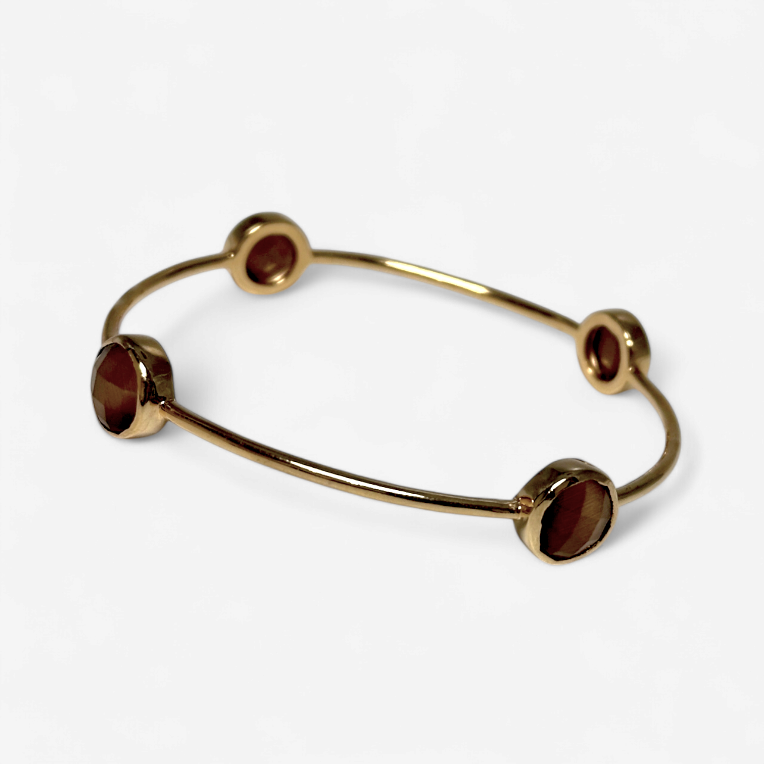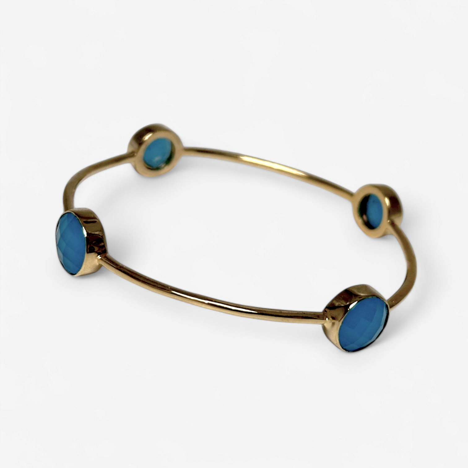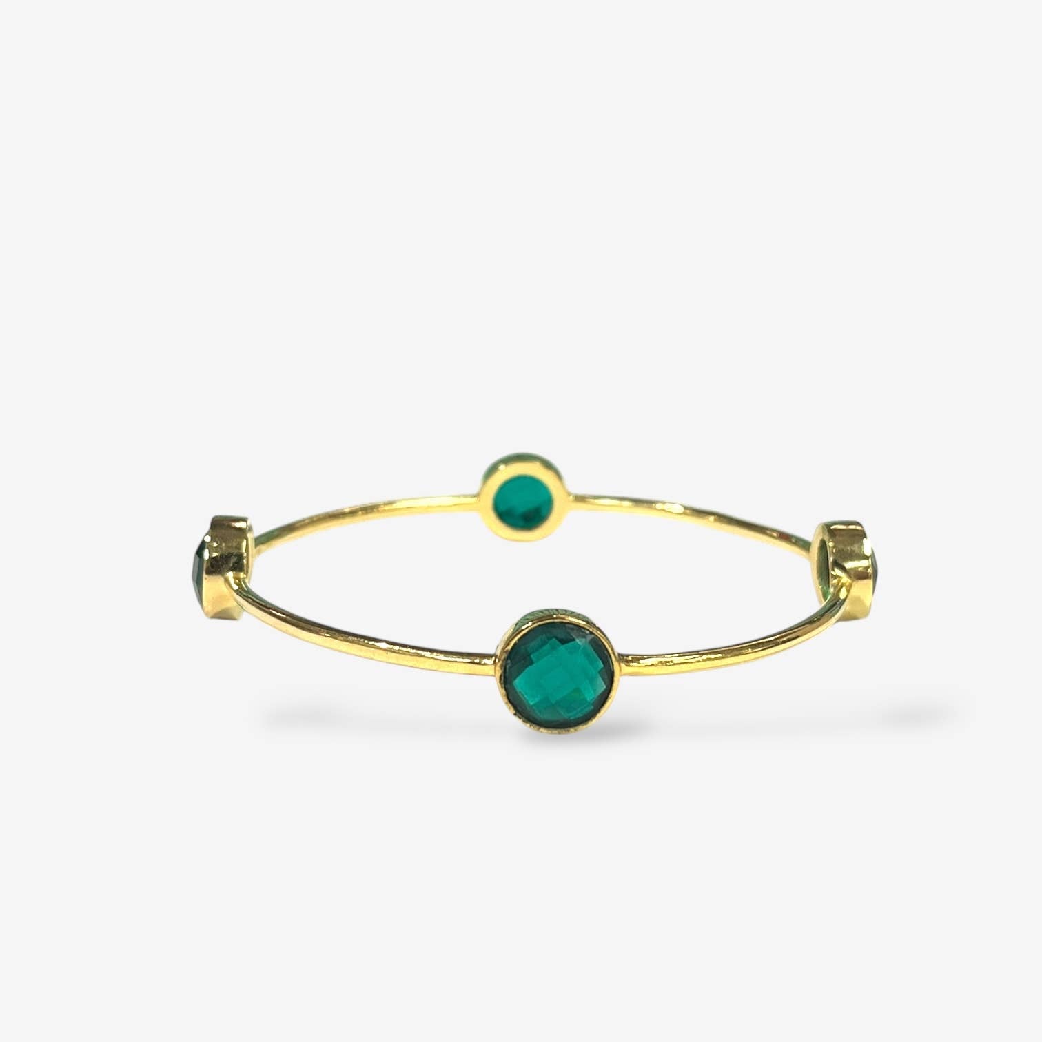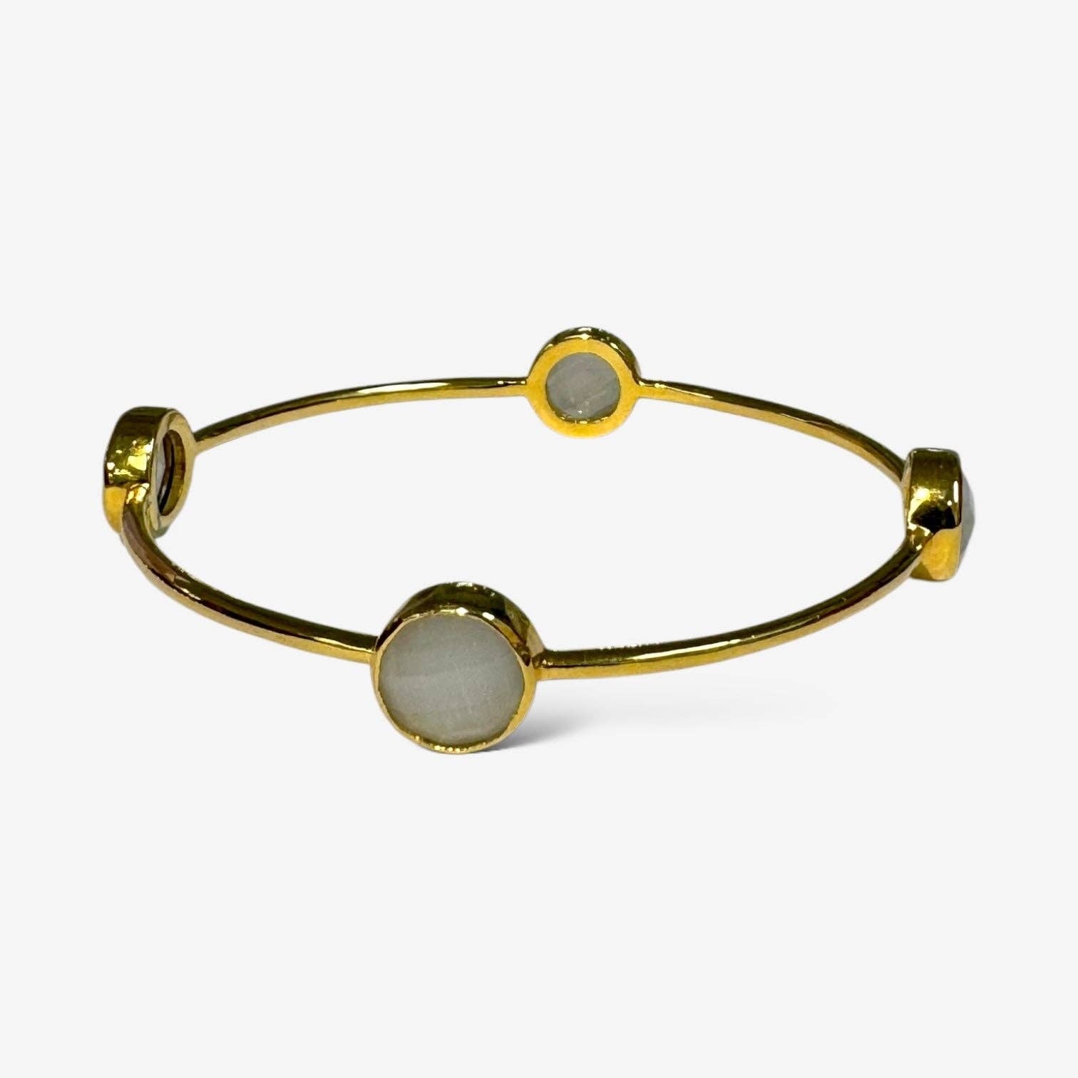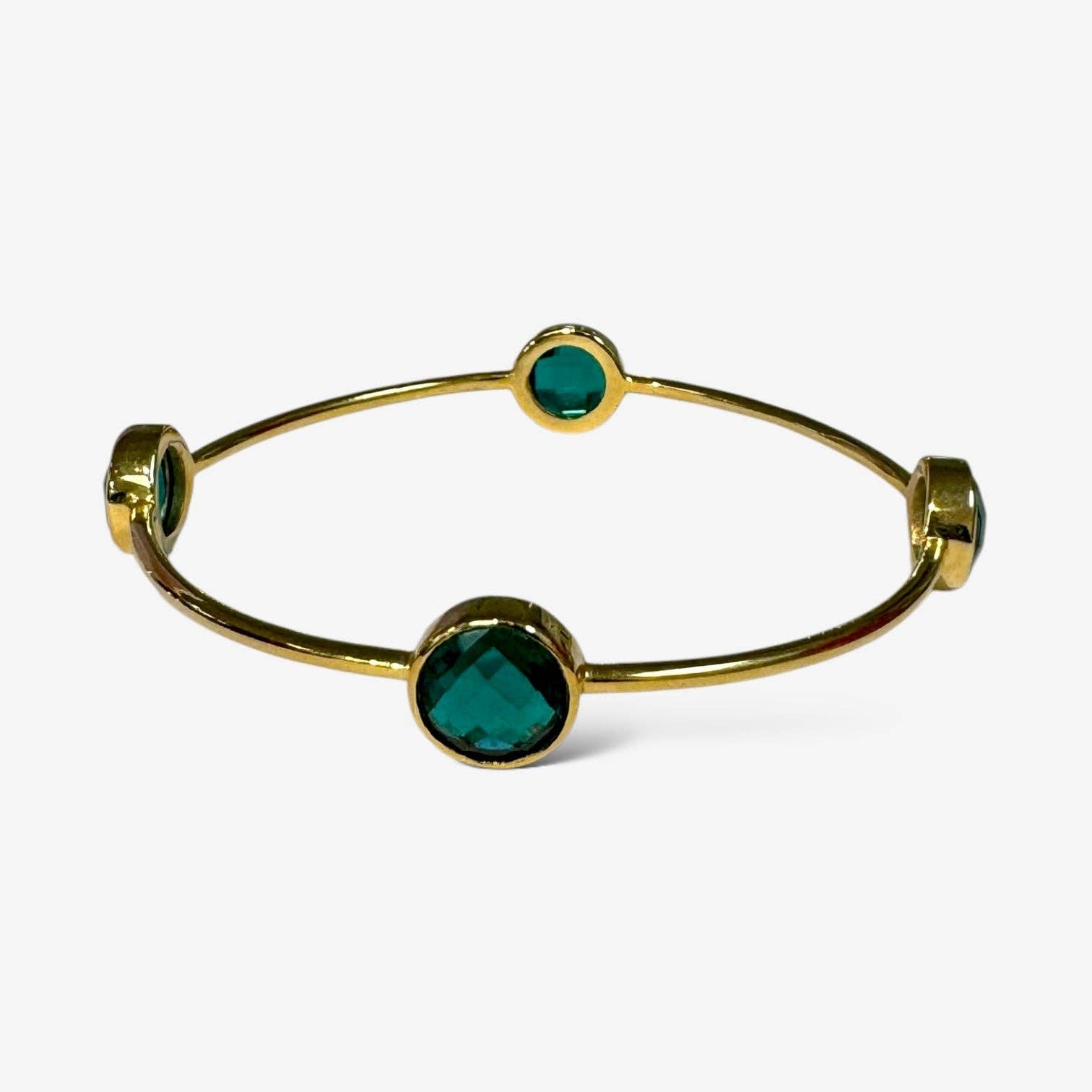 This elegant Hydro Twist brass bracelet features a 14kt gold plating, adding a luxurious finish to the design. It is adorned with four round hydroquartz stones, each carefully set to surround the bracelet with their radiant, translucent glow. The combination of warm gold tones and the subtle sparkle of the stones creates a sophisticated and timeless accessory, perfect for any occasion.