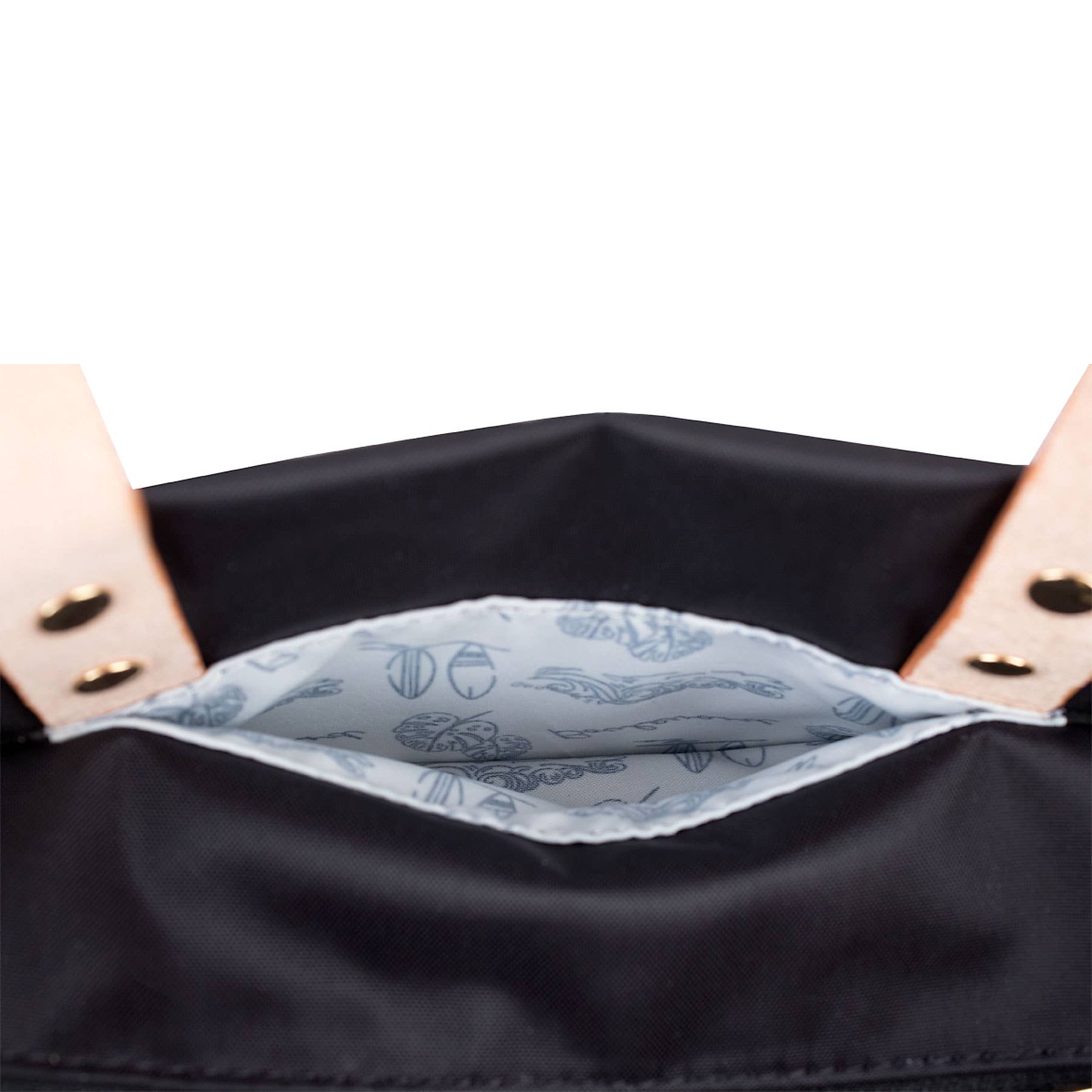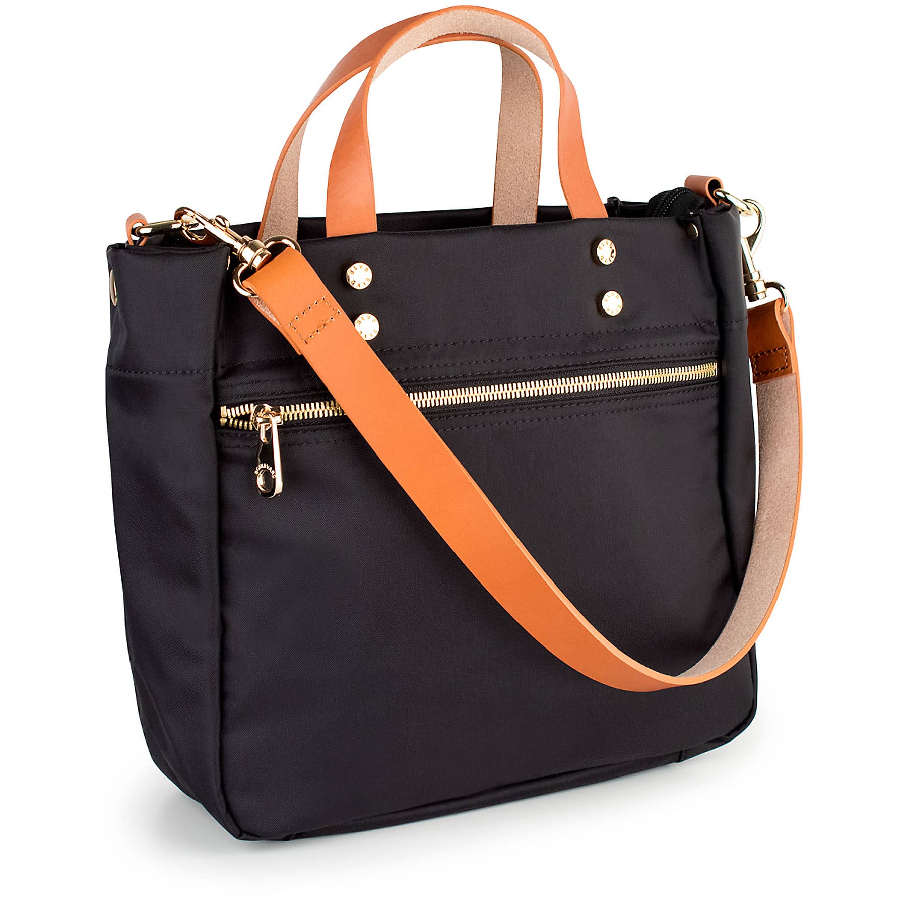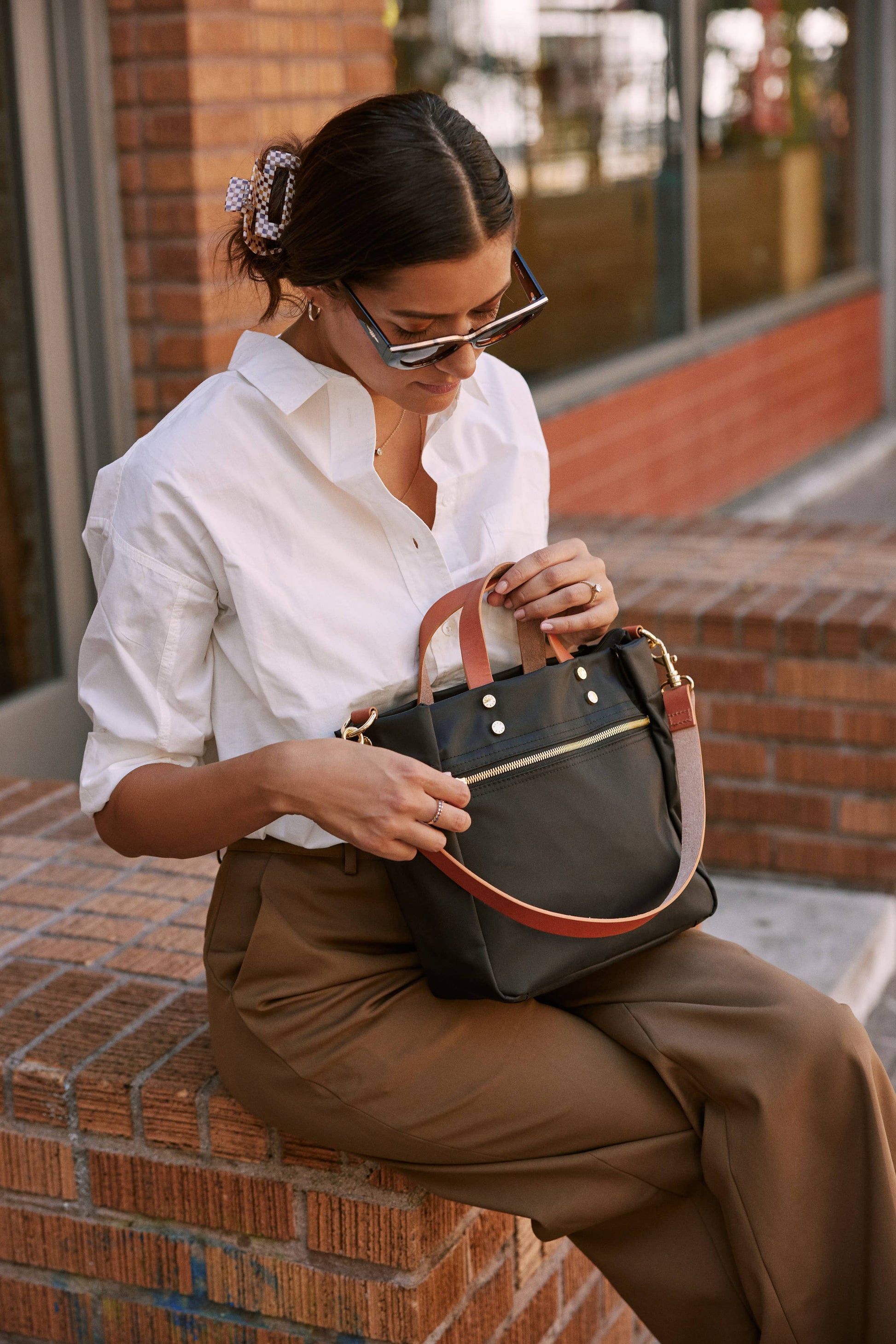 One of our best sellers. This simple silhouette is a crowd favorite with all of its user friendly compartments. It features side pockets perfect for water bottles and an umbrella, leather accents, as well as a zippered closure for security.