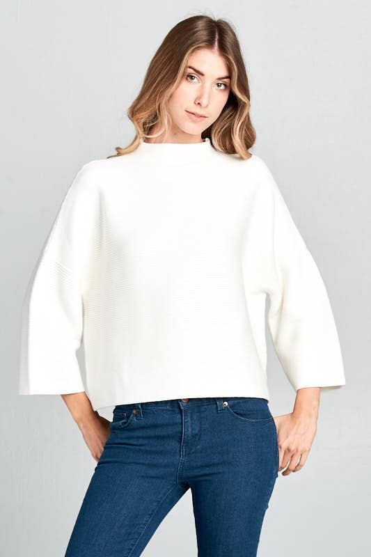 OVER SIZED ALONG THE WAY RIBBED TOP FEATURES A HIGH MOCK NECK WITH A SOFTNESS AND STRETCH FOR COMFORT . ¾ SLEEVES.