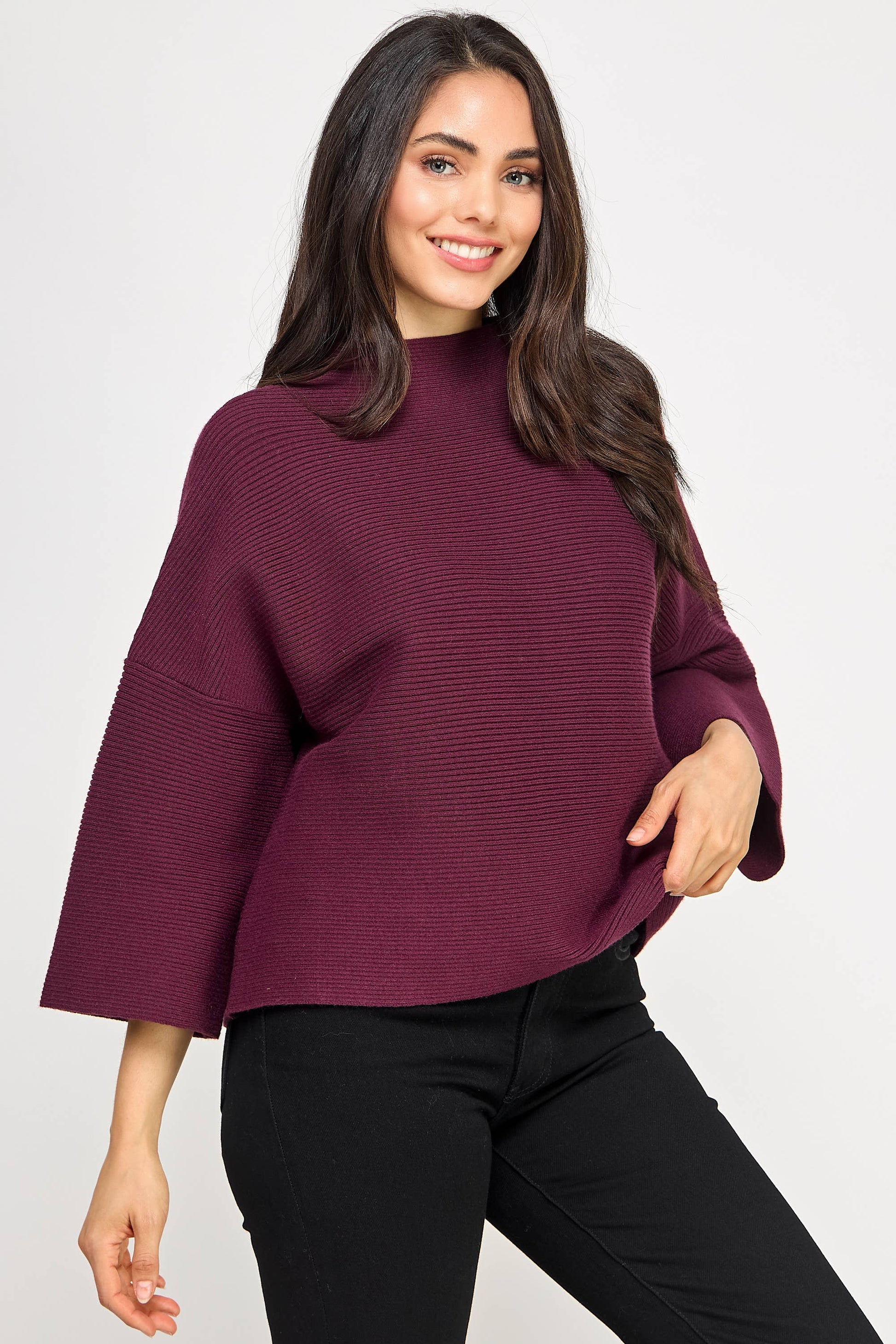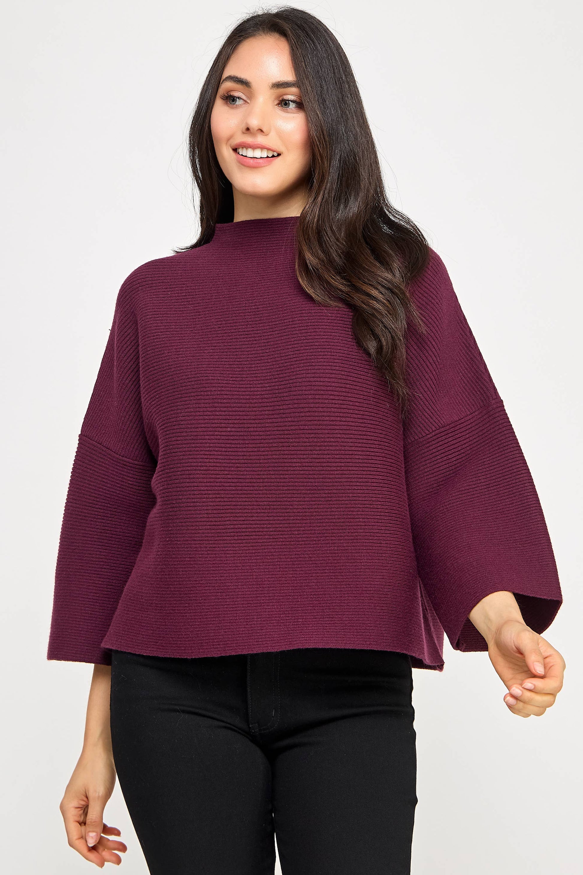 OVER SIZED ALONG THE WAY RIBBED TOP FEATURES A HIGH MOCK NECK WITH A SOFTNESS AND STRETCH FOR COMFORT . THREE QUARTER SLEEVES.
