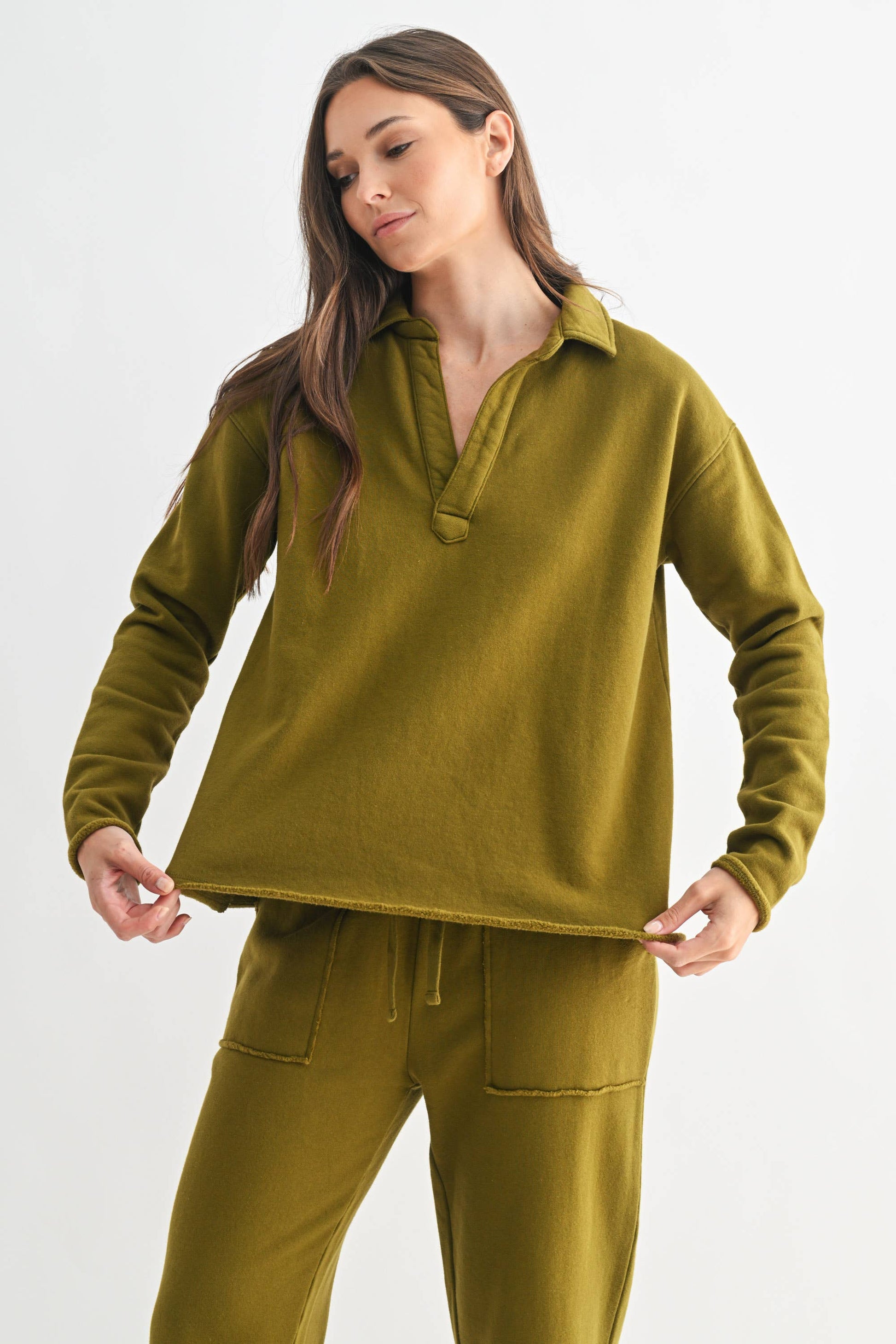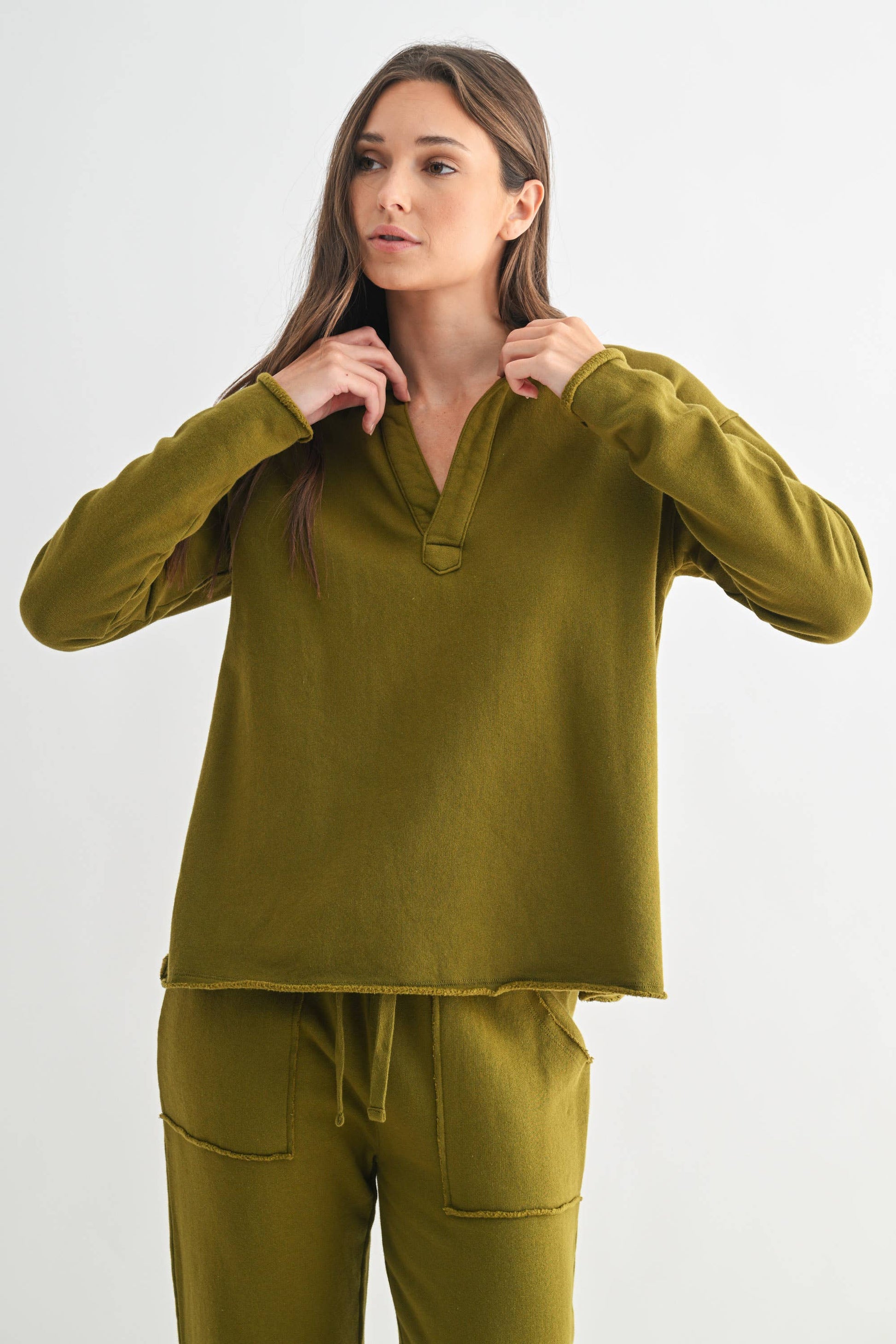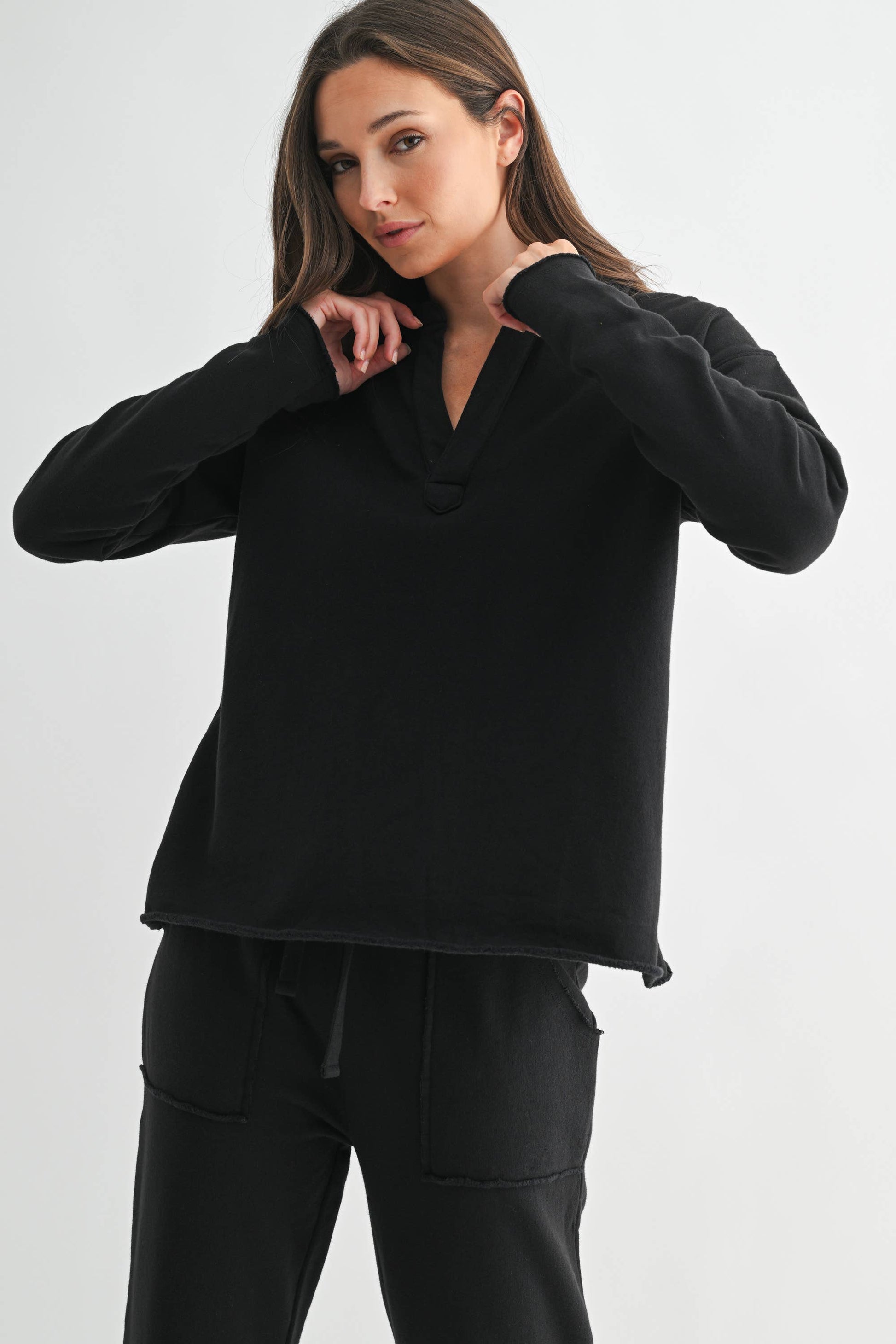 Henley-style long sleeve with a V-neck and raw-edge hem for a vintage look. Perfect for brunch or lunch, this versatile tee pairs effortlessly with denim for a casual yet polished vibe!