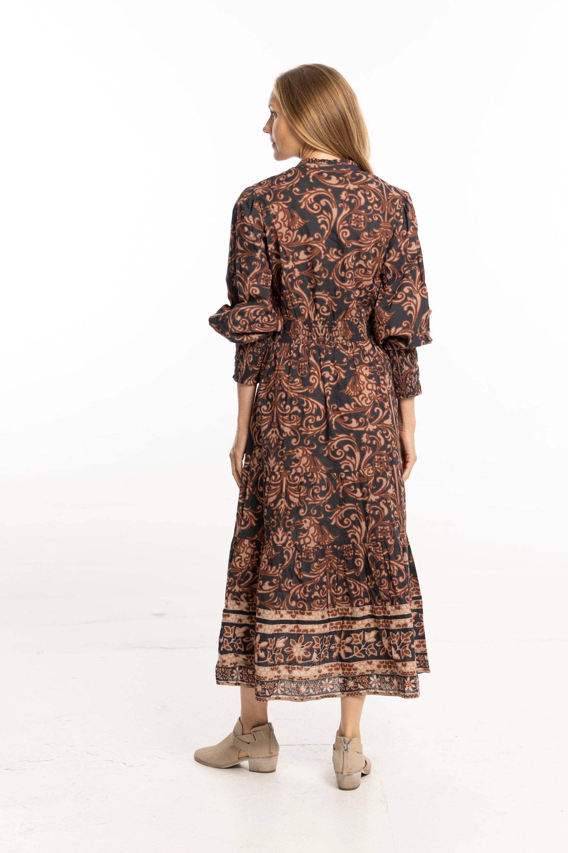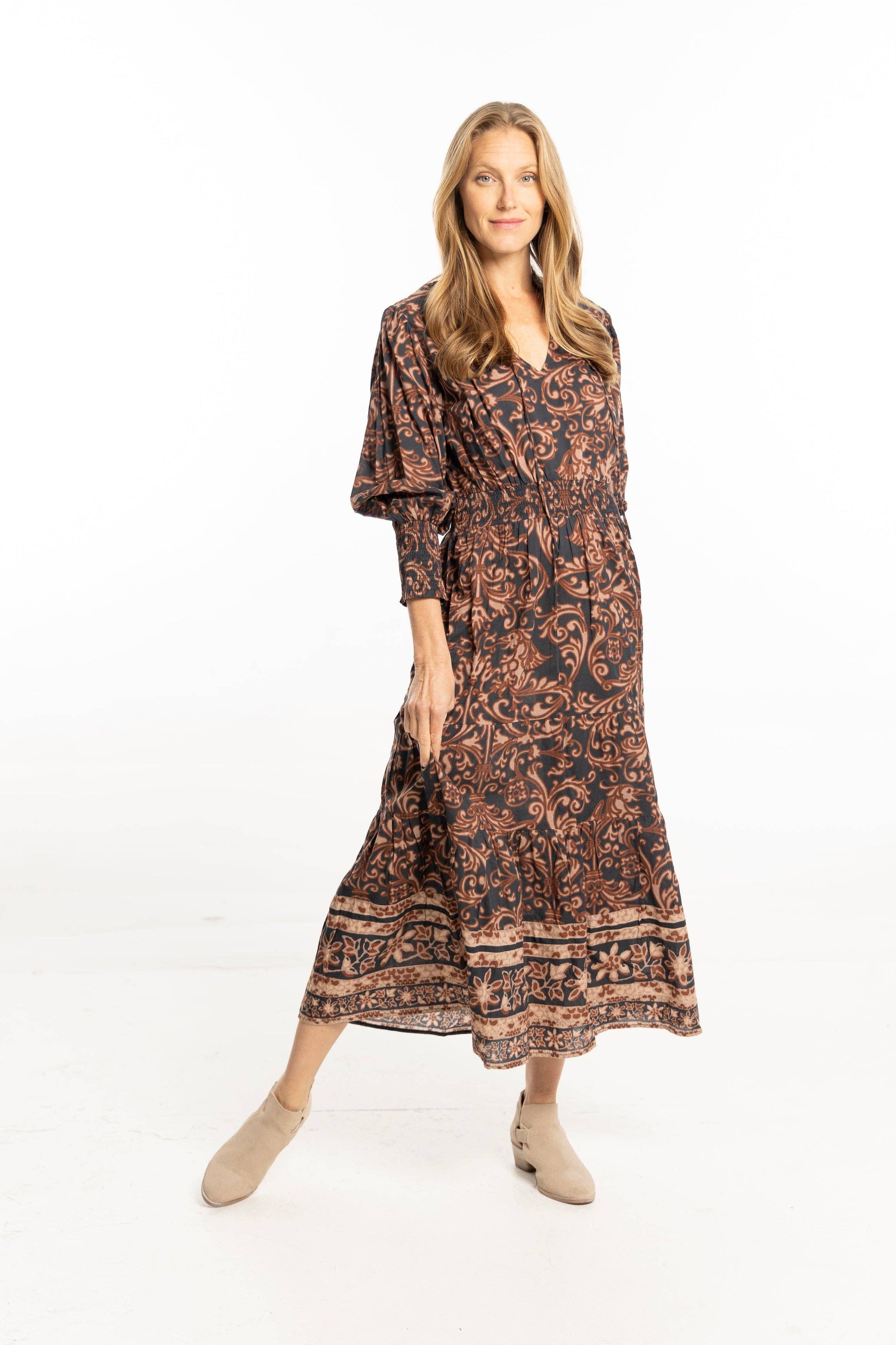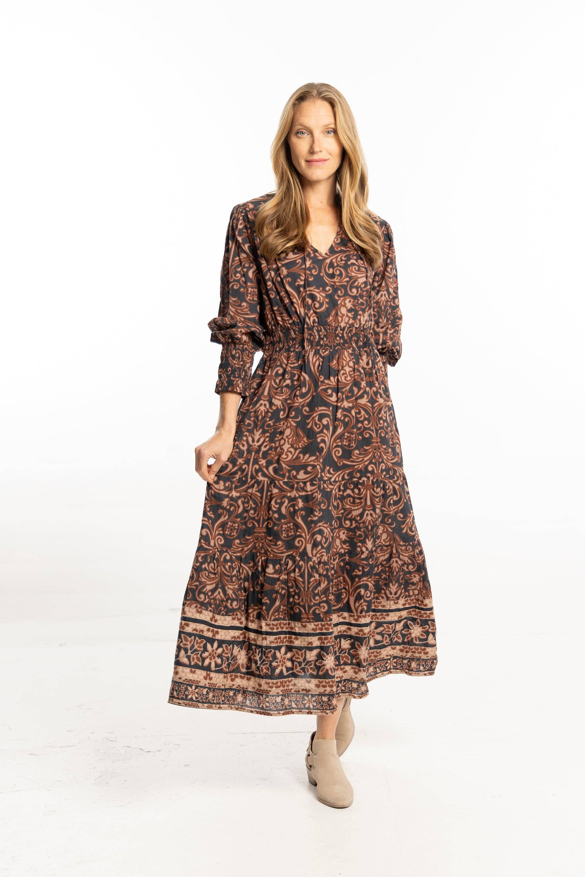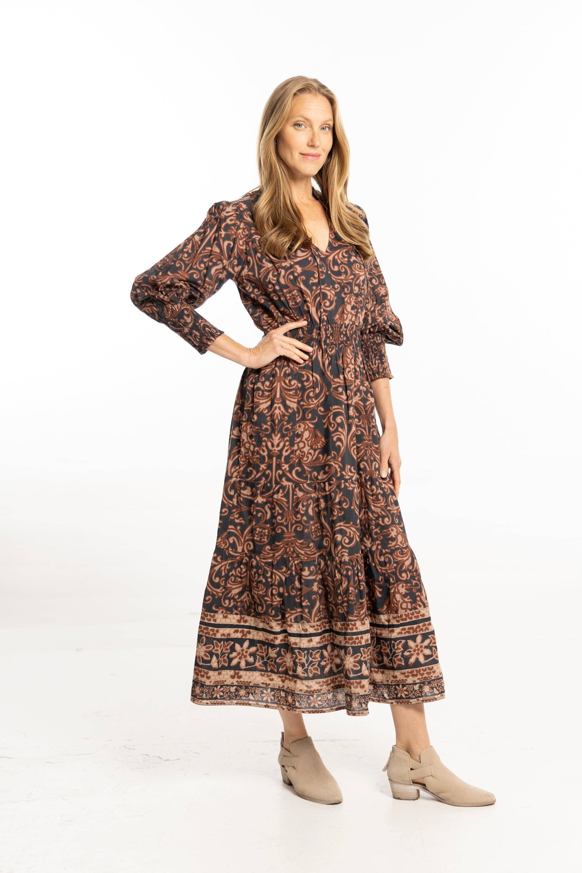 Our elegant Monica maxi dress features long sleeves in rich espresso and classic black. Designed with a flattering elastic waist and comfortable elastic cuffs, this dress offers a perfect blend of style and ease for any occasion.