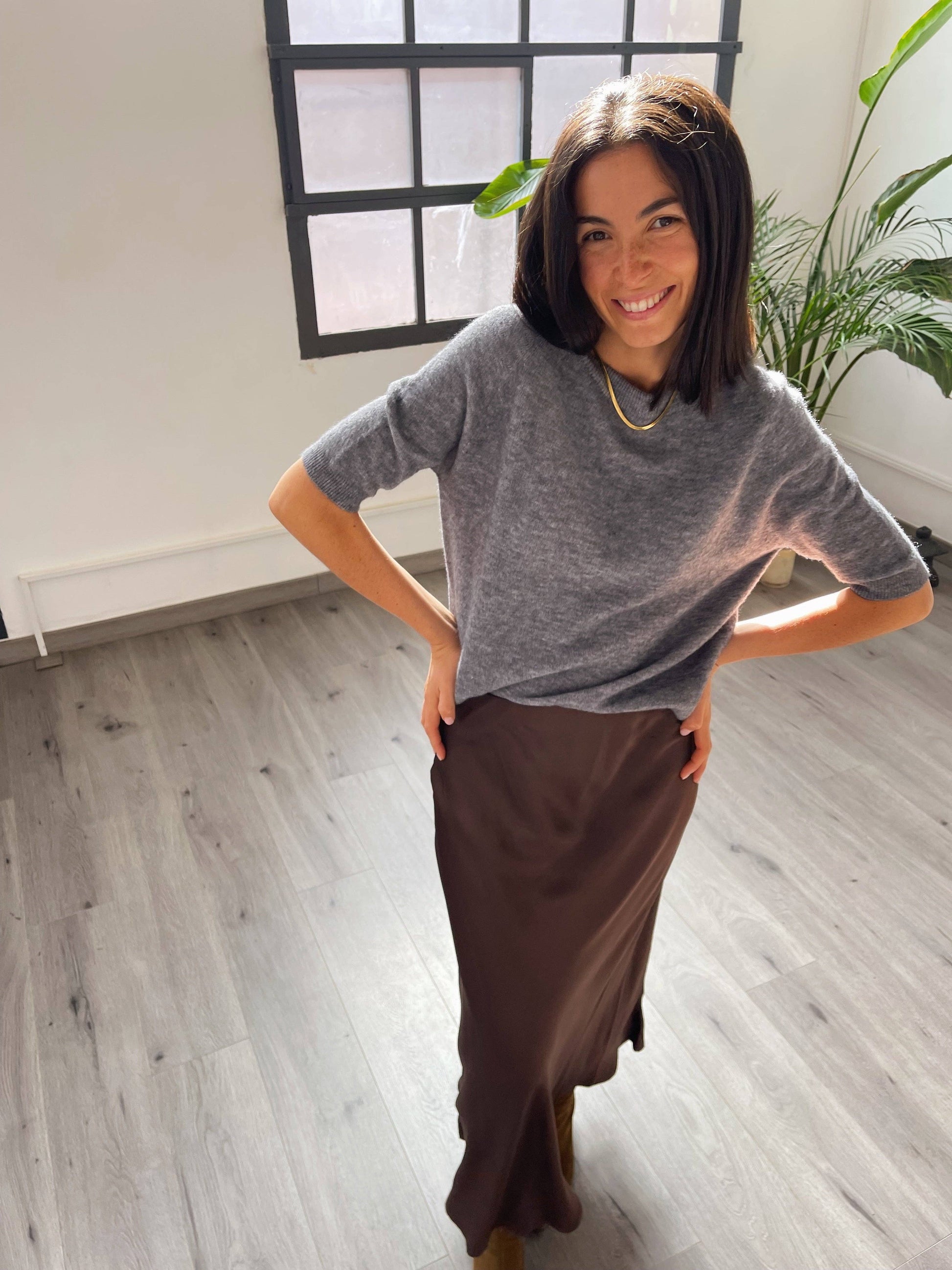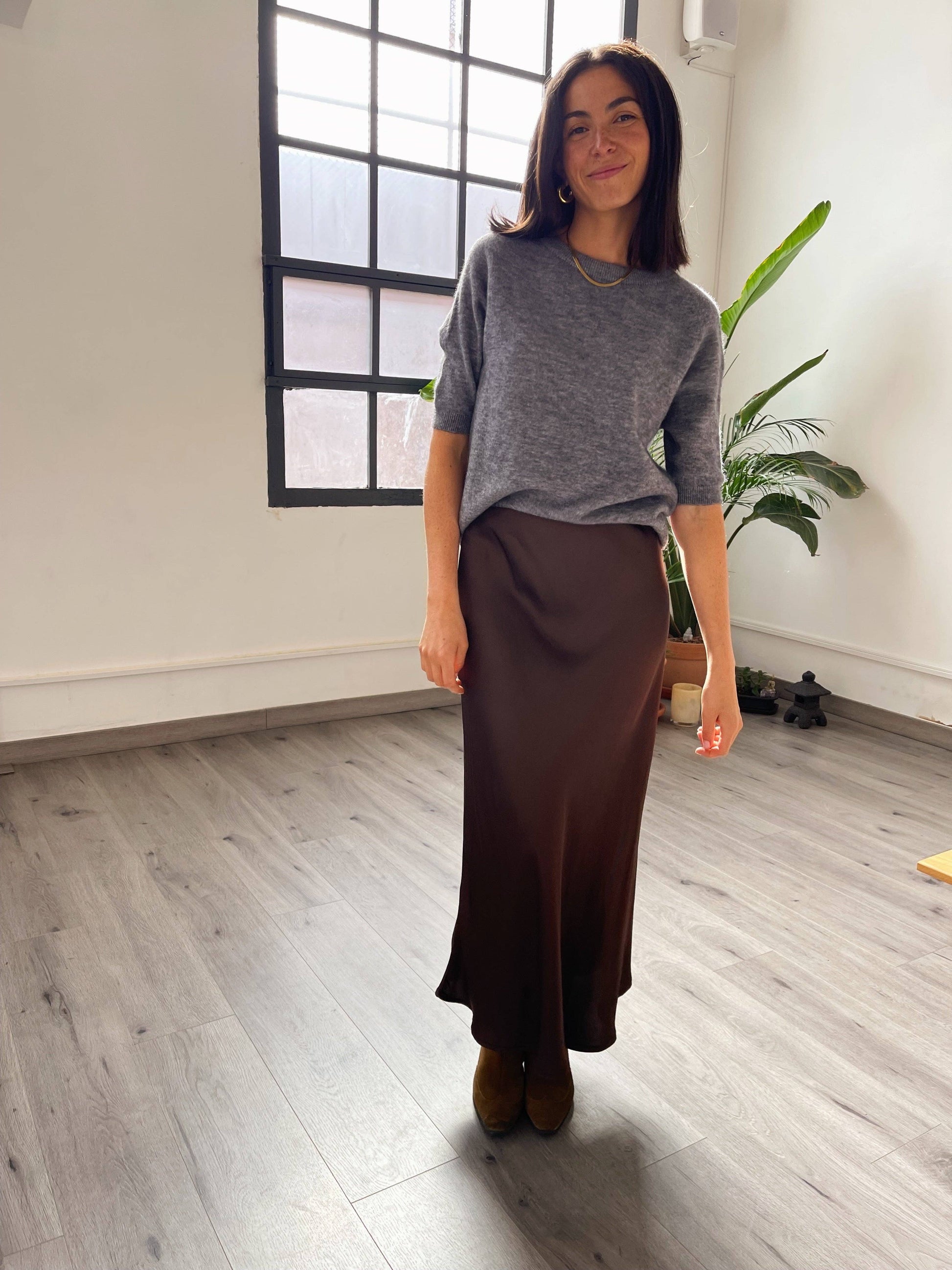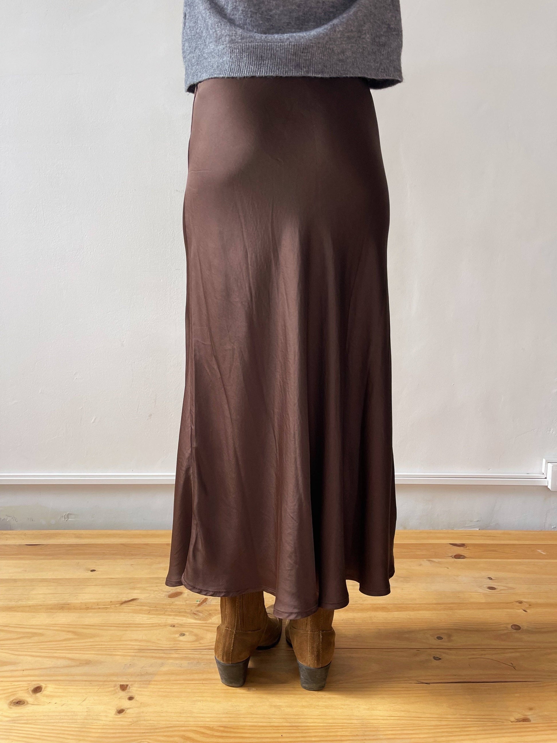Bias-cut skirt made of viscose satin in chocolate brown color.