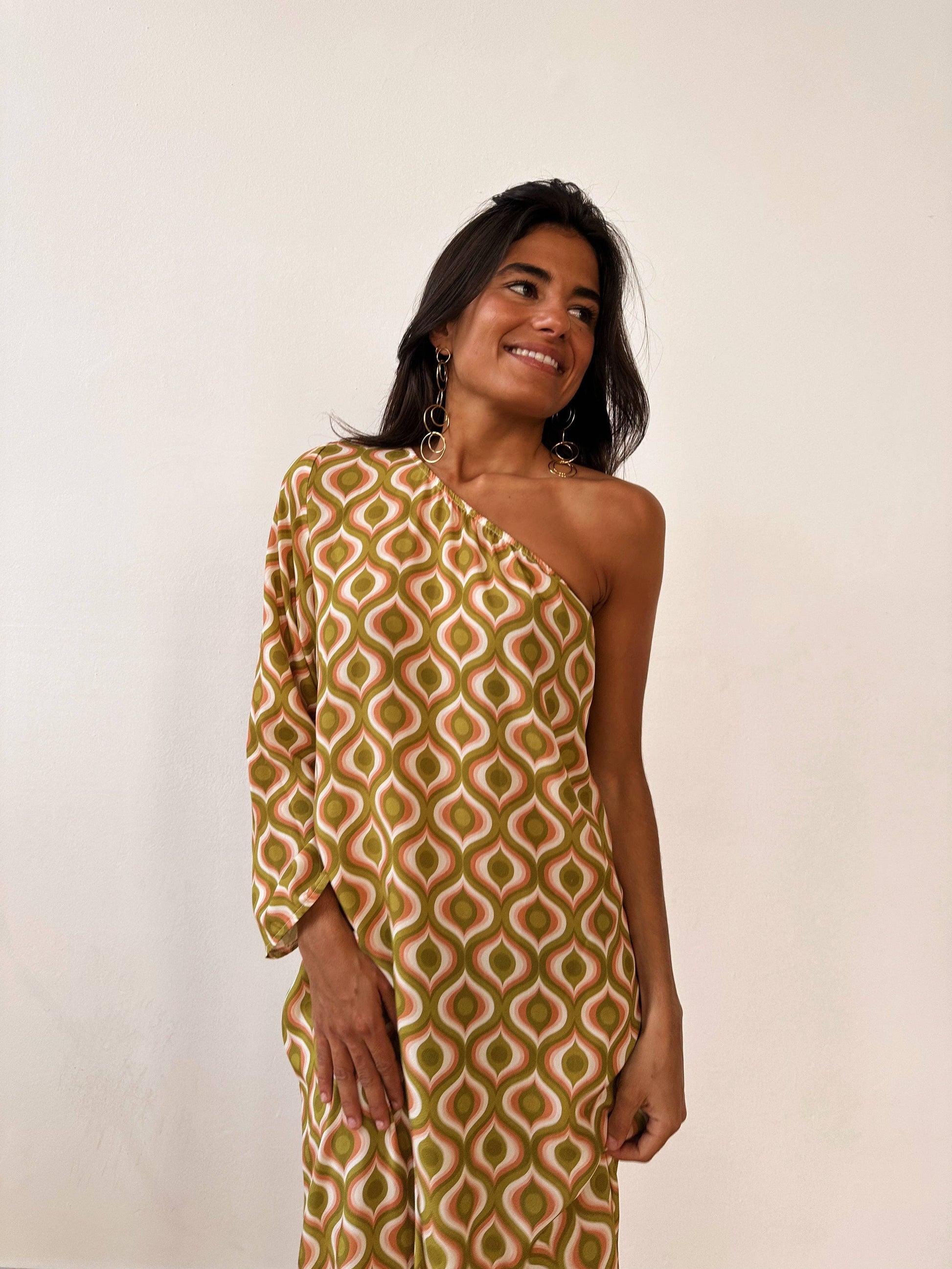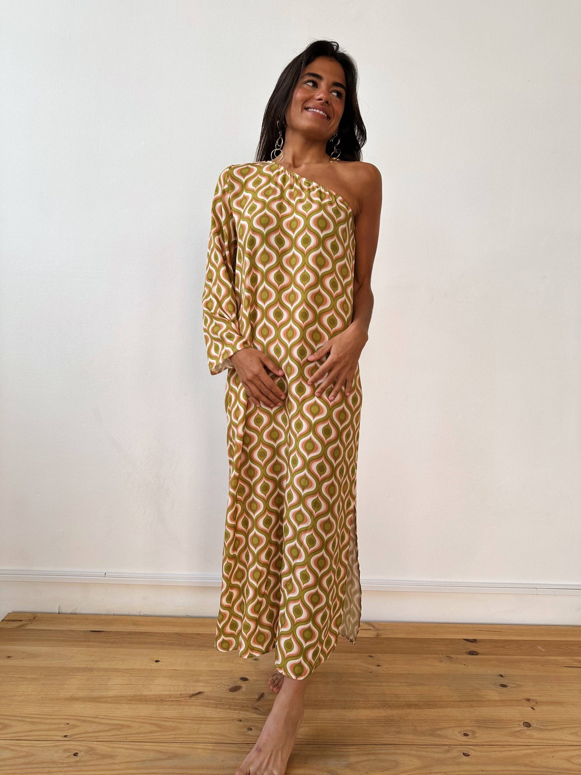 Long-sleeved asymmetric midi dress finished with elastic band.